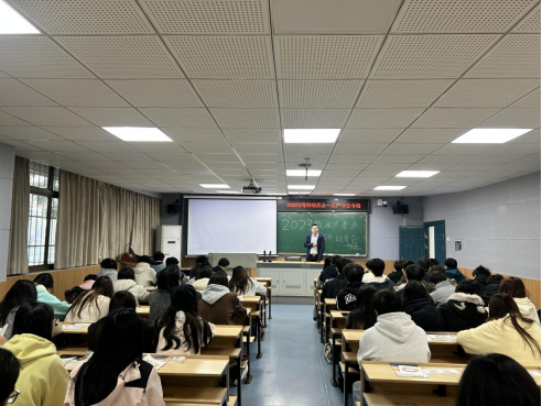 紧接着,贺江从个人理想、招聘现状等角度出发,为学生深入剖析考研的N种理由,并从考研人数、学院考研情况、省内相关学校同类学院的考研录取情况、各学科门类的国家线趋势出发,着重分析当前考研形势。他提出,学院十分重视考研工作,并通过加强学生党建、创新培养模式、打造服务体系等各项举措,营造考研氛围和文化,构建全员参与考研帮扶新格局。最后,他表示考研、考公与就业不是单选题,选择并坚持完成考研就是一种胜利,学院老师是大家考研路上的坚强后盾,祝愿大家都能够成功上岸。
