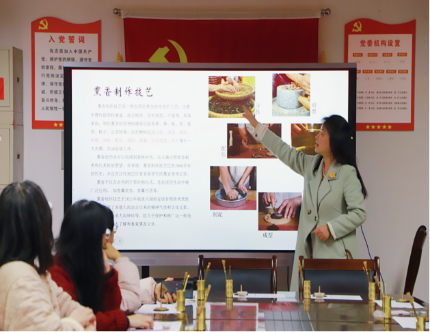 活动邀请非遗传承人为大家讲述唐代篆香和疏肝解郁香锤的相关知识,包括其悠久的历史背景、所用天然香料的功效,古法合香的理念等。随后,在传承人的指导下,女教师们进行了篆香和香锤的手作体验,在轻松愉悦中感受非遗文化的魅力。最后,老师们互相展示作品,交流心得,在袅袅香气中合影留念,为这场匠心体验画上圆满句号。(一审:李琼琼 二审:朱骏 三审:贺江)