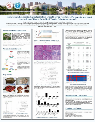 我院水生动物病害防控与健康养殖团队的罗玉双教授、陈中元副教授、王荣华副教授以及2025级硕士研究生钟慧参加了本次学术会议。团队以“Isolation and genomic characterization of multi-drug resistant Morganella morganii strain from Chinese Soft-Shell Turtle Pelodiscus sinensis”为题进行了墙报展示。该研究成功解析了一株分离自中华鳖的多重耐药摩根菌的基因组特征,为深入了解该病原的耐药机制和开发精准防控策略奠定了重要基础。